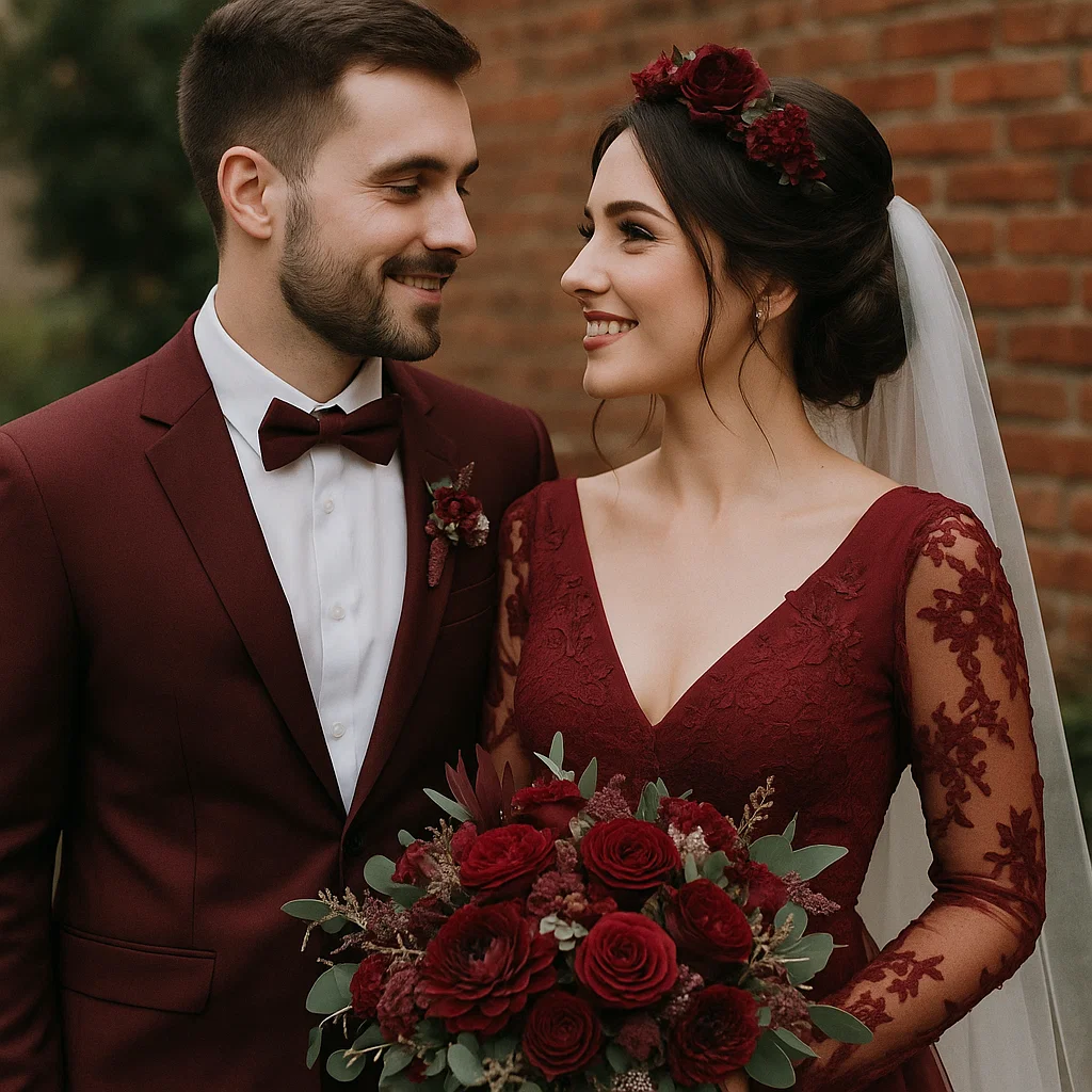 Марсала. Глубокий бордовый оттенок, ассоциирующийся с вином Марсала, что придало торжеству выразительность и драматизм. Свадьба в бордовых тонах — это единая стилистика, цвет преобладал в нарядах молодожёнов и гостей.
