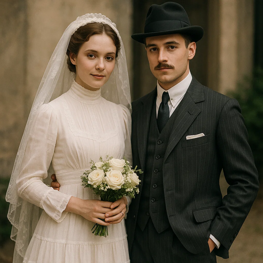 Была и пара, вдохновлённая началом XX века: у невесты преимущественно закрытое платье с высокой горловиной, лёгким рукавом, завышенной талией, многослойностью и оборками — не бальное, но утончённое. Жених — в строгом костюме в полоску, настоящий пижон.