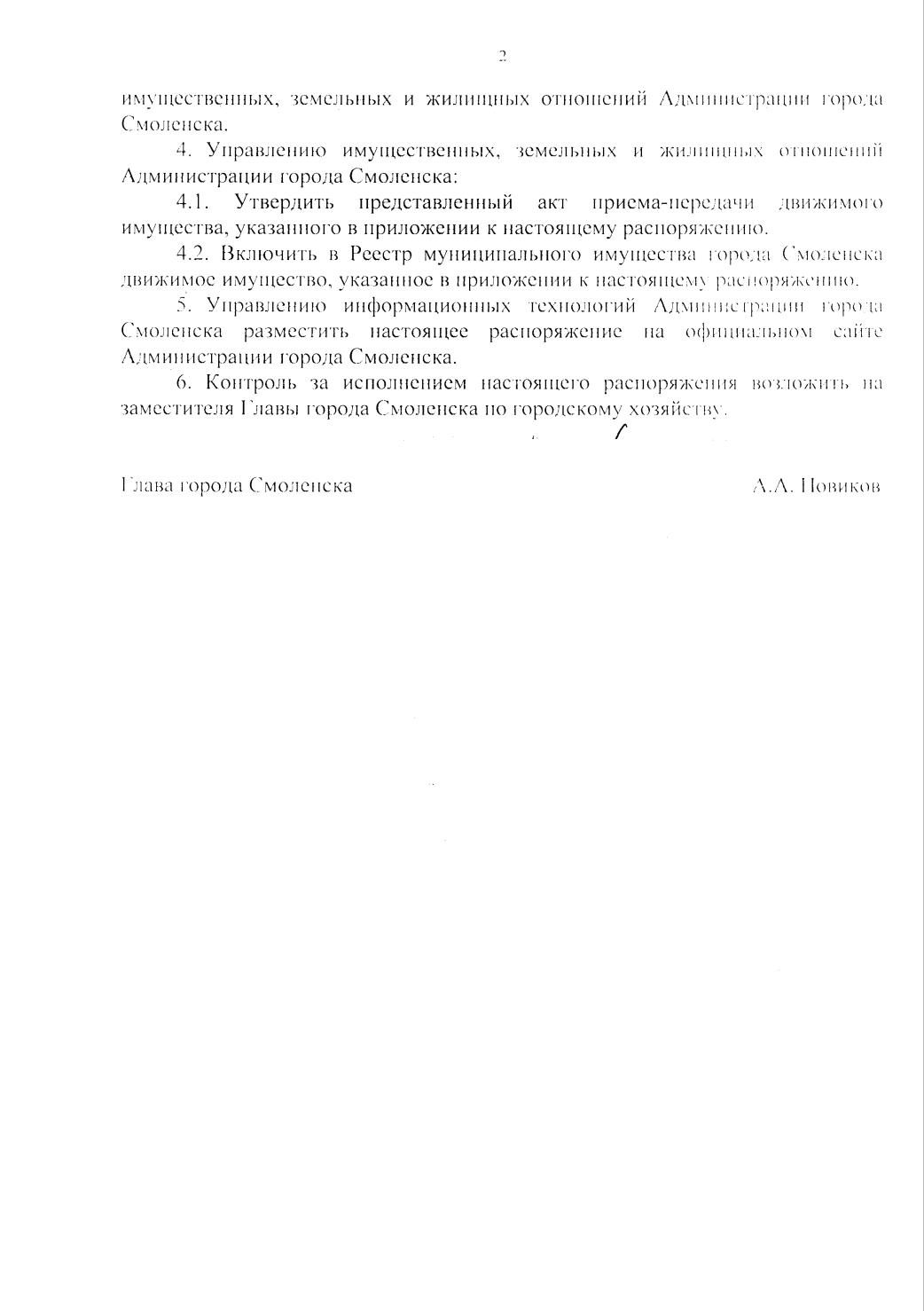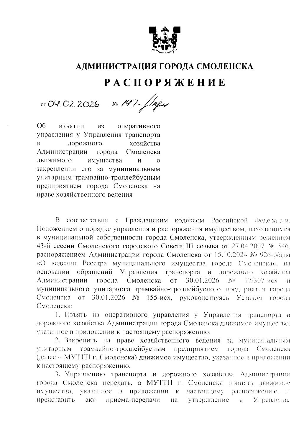 Скриншоты 1-2: Распоряжение Администрации № 147-р/адм от 04.02.2026 «Об изъятии из оперативного управления у Управления транспорта и дорожного хозяйства Администрации города Смоленска движимого имущества и о закреплении его за муниципальным унитарным трамвайно-троллейбусным предприятием города Смоленска на праве хозяйственного ведения». Подписано: Глава города Смоленска А.А. Новиков.