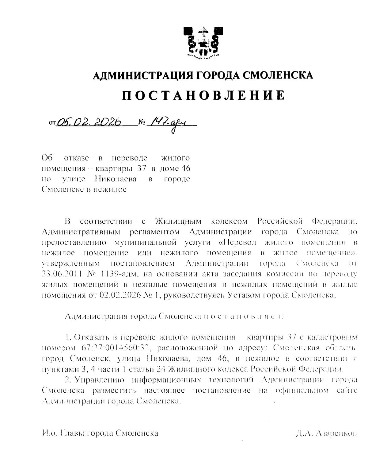 С 5 февраля на официальном сайте Администрации города Смоленска стали публиковаться муниципальные правовые акты за подписью и.о. главы города Дениса Александровича Азаренкова. Первым таким документом стало Постановление №147-адм от 05.02.2026 «Об отказе в переводе жилого помещения в нежилое» по адресу: ул. Николаева, д. 46, кв. 37.