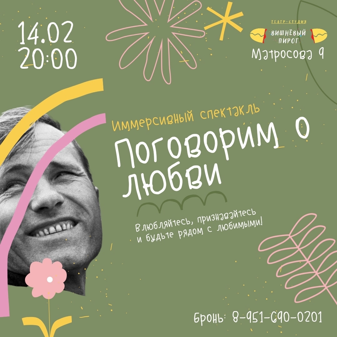 14 февраля в 20:00 театр-студия «Вишневый пирог» приглашает зрителей на иммерсивный спектакль, посвященный Дню всех влюбленных. Это вечер, где любовь покажут без прикрас — смешную, неловкую, трогательную и очень настоящую.